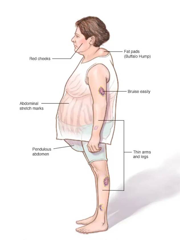 - Purple or pink stretch marks (striae) on the abdomen, thighs, breasts, and arms